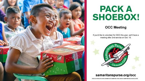 As we prepare for this year's Operation Christmas Child, we will be having a meeting on Sunday, October 19th right after 2nd service for anyone interested in serving at the OCC Booth and collection. You can sign up online if you're interested.