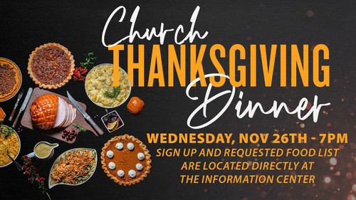 Come and join us on Wednesday, November 26th at 7pm as we have a time of food, fellowship and thanksgiving with one another at our Church Thanksgiving Dinner! For head count and food purposes, please sign up directly at the Information Center, or email us at info@calvarychapelpr.com, let us know how many people are coming with you, and select which dish you will bring. The church will provide the drinks, plates and cutlery. We will also provide the half size aluminum trays for you to take and bring the food in, so that it is ready to set in the warmers, you can pick them up at the Information Center as well. Let's enjoy the time together as one church family!